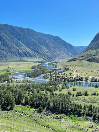 Beautiful valley of the Chuya River near the village of Aktash. Altai Republic district of Ulagan River Chuya.