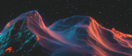 Mystical starry night sky envelops ethereal mountains with vibrant colors and patterns