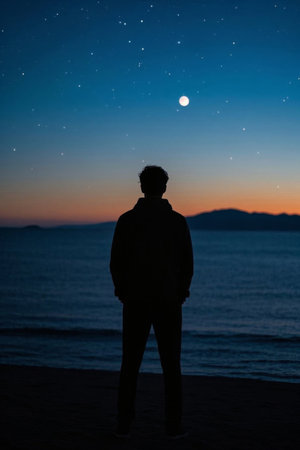 A breathtaking silhouette of a person stands against a mesmerizing starry night sky, surrounded by majestic mountains and offering a moment of serene reflection.