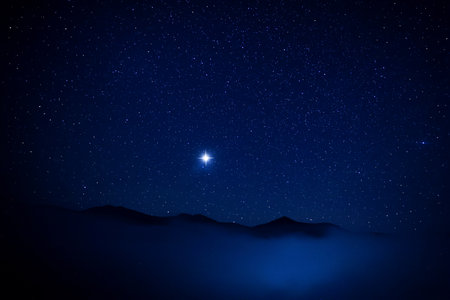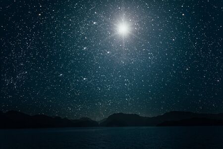 A close-up of a single, bright star shining prominently in the night sky, with a dark and vast space background creating a striking, minimalist effect.