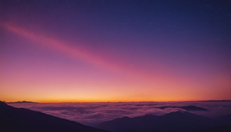 Beautiful starry sky above the clouds at sunrise in the mountains