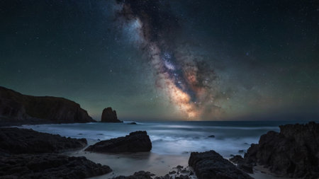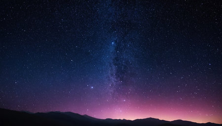 Bright stars and colorful gas clouds fill the night sky showing the beauty of the universe above a dark landscape during late evening. The scene displays deep space elements vividly.