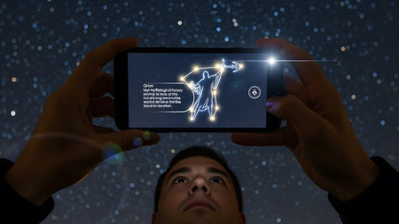 Man looks up at smartphone showing Orion constellation AR app in starry night sky Clear details a...