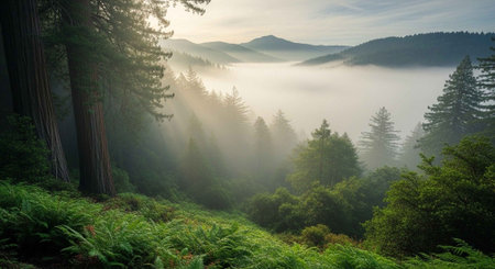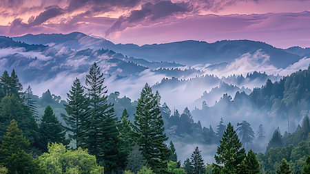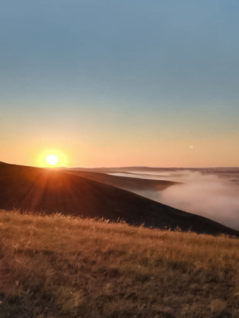As the sun sets, it casts a warm glow over the foggy hillside, creating a stunning view that captures natures beauty and serenity at dusk, offering a moment for reflection and appreciation