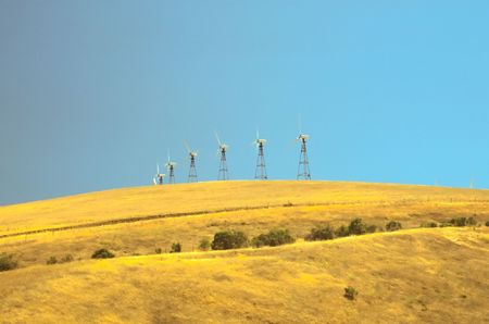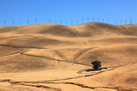 Soft hills of California. An autumn yellow grass and windmills on horizon