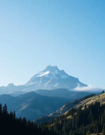 Beautiful alpine mountain landscape with snow covered peaks in the clouds