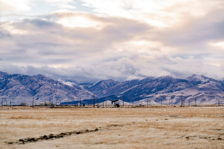 Agricultural atmospheric landscape with farmland with plowed fields and sloping meadows and oil pumps in a valley framed by a mountain range against the background of a cloudy sky in California