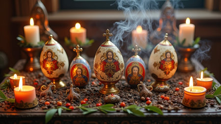 Ornate easter eggs and lit candles in a festive religious display. That the image is generated using AI.