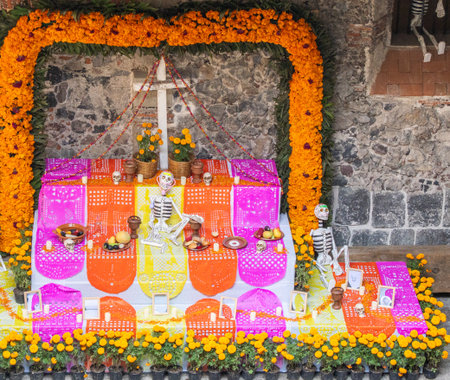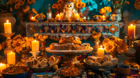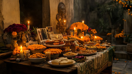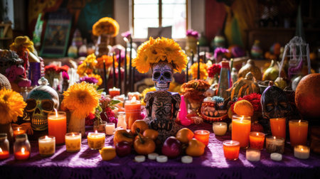 Dia de los Muertos, Mexican holiday. ofrenda altar adorned with candles, flowers, photos, and traditional food offerings, creating a sacred space for remembrance and honoring the deceased.