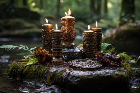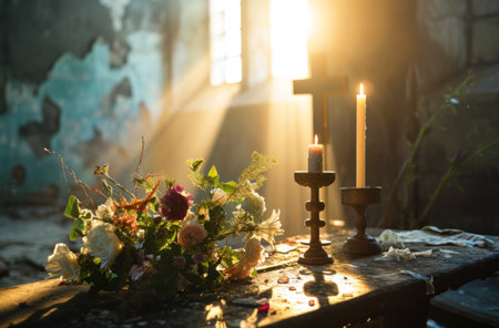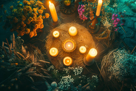 A serene traditional altar featuring a flickering candle and incense, surrounded by delicate flowers and shells, embodying peace and spirituality.