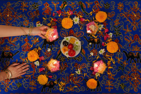 Diwali celebration. Hands placing decorative lamps on colorful rangoli.