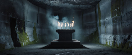 AI Generated. Mysterious Underground Chamber with Stone Altar Illuminated by Flickering Torches