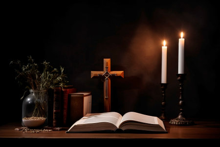 Holy Bible and Cross on Desk. Minimalism, dark and light.