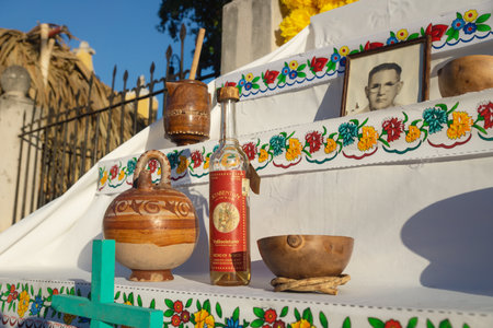 Merida, Mexico - 31 October 2018: Traditional altar for day of the dead, dia de los muertos with Maya terracotta and photo of deceased