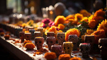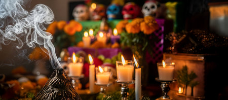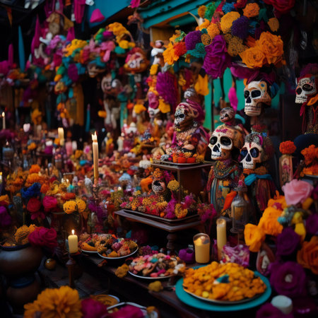 Vibrant dia de los muertos altar with lit candles and colorful skulls celebrating day of the dead tradition. concept of mexican heritage, ancestral remembrance, cultural celebration.