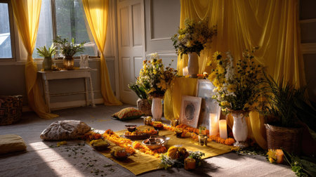 A vibrant and inviting interior setup featuring yellow drapes and a beautiful floral display, perfect for celebrations or cozy gatherings.