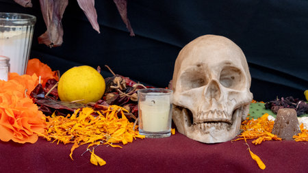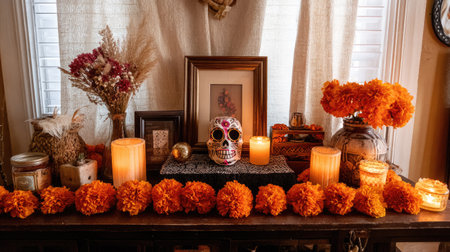 An altar arrangement features a decorative skull, glowing candles, and vibrant orange flowers. Various objects and framed pictures are set against a window with sheer curtains. The composition utilizes warm lighting creating a festive atmosphere, suitable for various editorial and commercial projects.