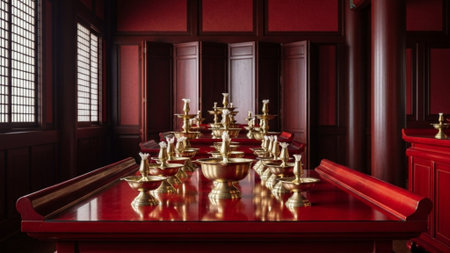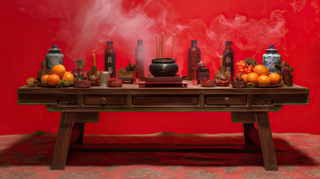 A traditional altar adorned with incense and candles, set against a vibrant red backdrop. Offerings and decorations reflect rich cultural spirituality and heritage.
