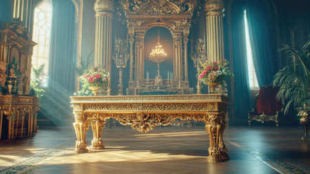 This image features a stunning golden table set in a lavish interior, illuminated by soft sunlight, highlighting intricate decorations and floral arrangements.