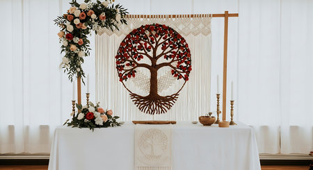 ceremony setup with a wooden altar, candles, and flowers, created with generative ai