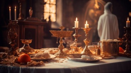 Holy communion on table on church.The Feast of Corpus Christi Concept. Generative AI illustrator