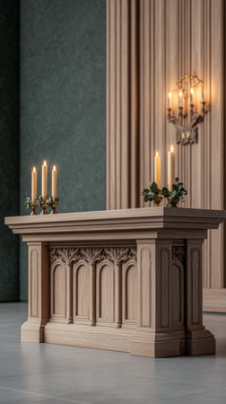 VATICAN CITY, Symbolic papal altar featuring a golden tiara, chalice, and Gospel book between two lit candles under heavenly light, reflecting solemn Catholic tradition