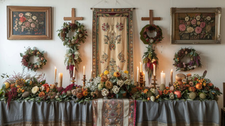 Display of handmade Saint Joseph's Day decorations, including wreaths, candles, and embroidered linens.