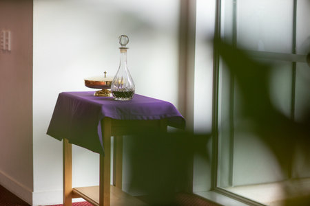bottles of water and wine on the altar for the celebration of Holy Mass