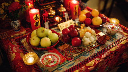 A serene Asian altar decorated with vibrant fruits, glowing candles, and incense, creating a peaceful ambiance for spiritual reflection and cultural celebration.