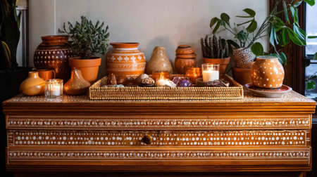 This captivating arrangement features rustic earthenware pots, lush succulents, and warm candles on a wooden table, creating a cozy and inviting atmosphere.