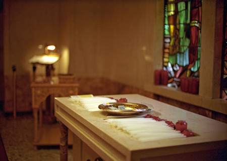 Christian cross, altar, candle and flower bouquet in a church chapel