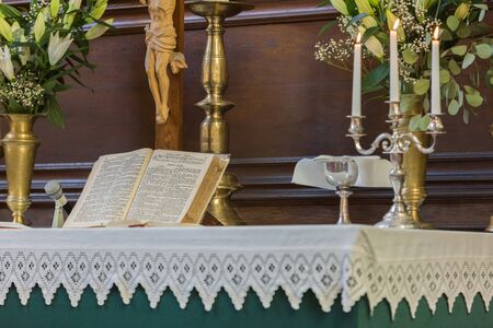 City Cesis, Latvia. An old Bible is open on the prayer table. 25.01.2020