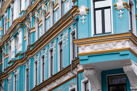 Full color horizontal photo. Elements of the facade of a historical building. Architecture in the classical style. In shades of blue.