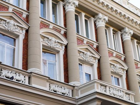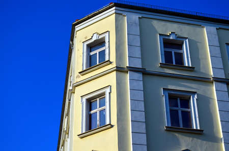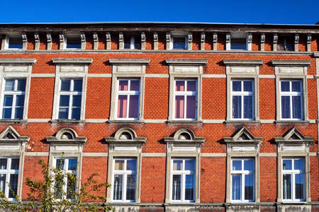 Many windows on facade of the urban historic building front view, Stockholm, Sweden