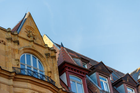 Low-angle shot of building tops against a blue sky. Features ornate architecture with tile roofs and decorative facades.
