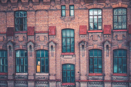 artful facade of an old decaying residential building with windows reflecting the surroundings. vintage filter effects.