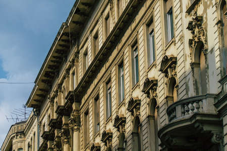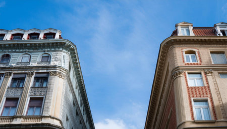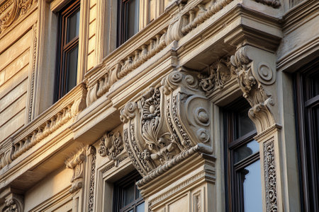 Explore the intricate details of a historic building facade, highlighting ornamental features and elegant craftsmanship in this stunning architectural photograph.