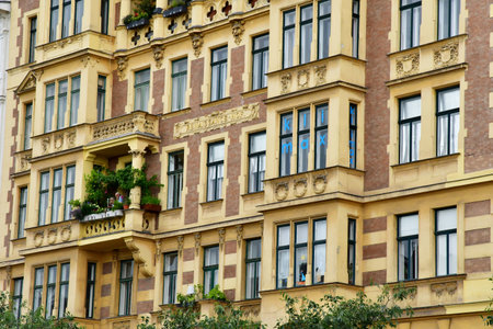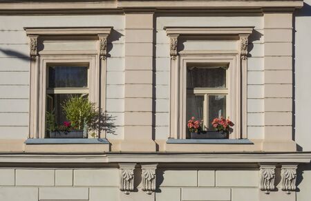 detail of beige facade of old prague tenement house Windows with flower boxes