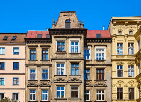 Old residential tenement houses during sunset. Bright warm afternoon light. Blue sky.