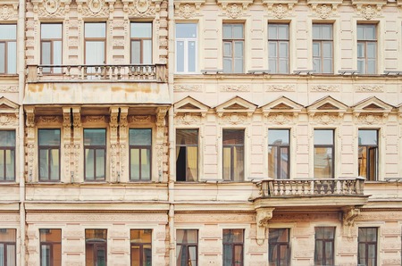 Many windows in row and bay window on corner of facade of urban apartment building angle view, St. Petersburg, Russia