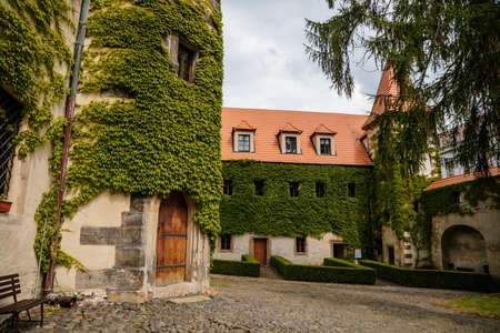 Benesov nad Ploucnici, North Bohemia, Czech Republic, 26 June 2021: old saxoxy renaissance castle at summer sunny day, stone towers with spiers, ivy braided beige walls, green trees at the street.