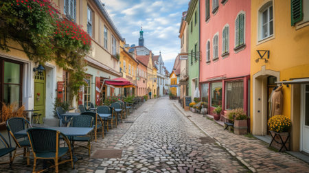 Quaint European street with colorful facades and cobblestones. A picturesque cobblestone street lined with colorful buildings and outdoor cafes in a quaint European town. Resplendent.