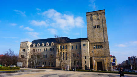 Chemnitz city center during sunny day. Chemnitz town-hall building and clock tower with blue sky and white cloud.