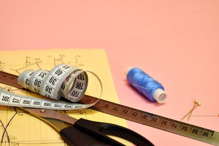 Tailors tools, scissors, measure tape and ruler on the sartorial work table
