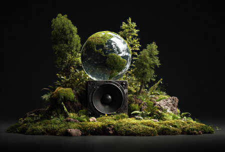A conceptual image presents a clear globe representing earth, integrated with a speaker, surrounded by lush green foliage. The composition uses a dark background to highlight the central subjects. The artwork conveys an environmental theme. Suitable for commercial applications such as advertising or editorial content.
