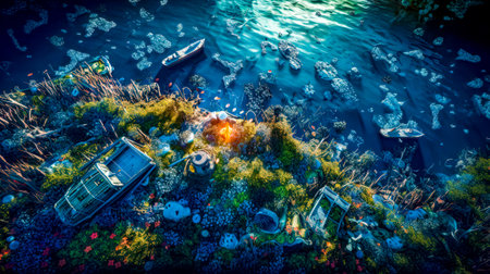 Trash seen in polluted ocean waste floating in illuminated waters image. Concept Polluted Ocean, Trash in Water, Pollution Awareness, Ecological Impact, Marine Environment