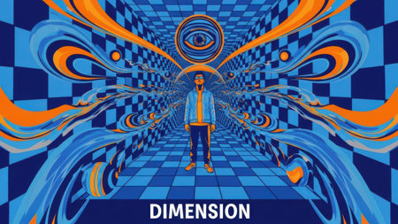 The image depicts a person walking through a tunnel with a psychedelic, swirling pattern. The tunnel is composed of blue and orange geometric shapes that create an illusion of depth and movement. The person is dressed in a suit and tie, adding a formal touch to the surreal setting. The overall atmosphere suggests a journey through different dimensions or states of consciousness.