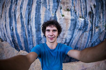 A man takes a selfie against a background of beautiful blue rocks, A man travels to picturesque places of the world, Rocks of Turkey, Rock climbing in Turkey.