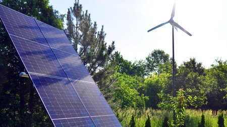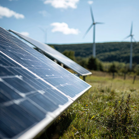 Promoting sustainable energy with solar panels and wind turbines in a vibrant landscape