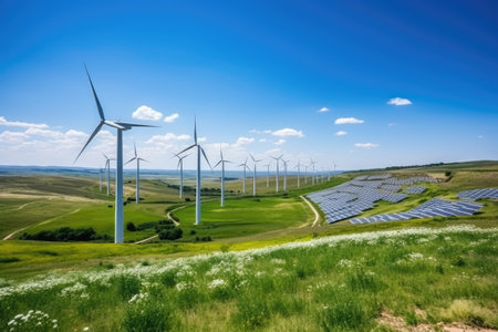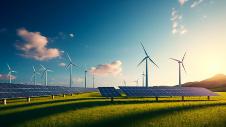 A landscape showcasing wind turbines and solar panels generating clean, renewable energy under a clear blue sky. A sustainable power solution for the future.